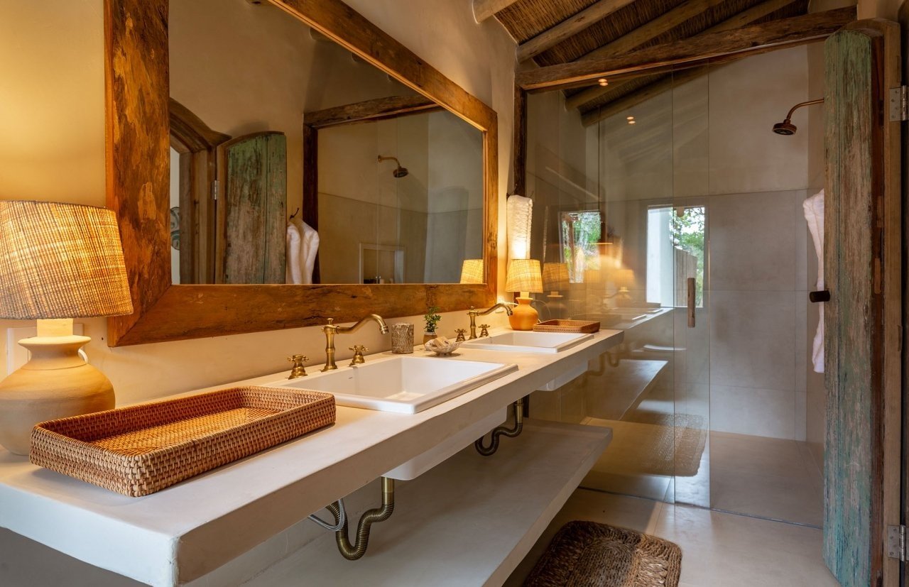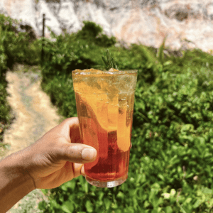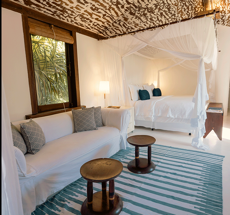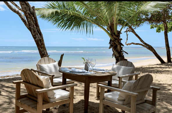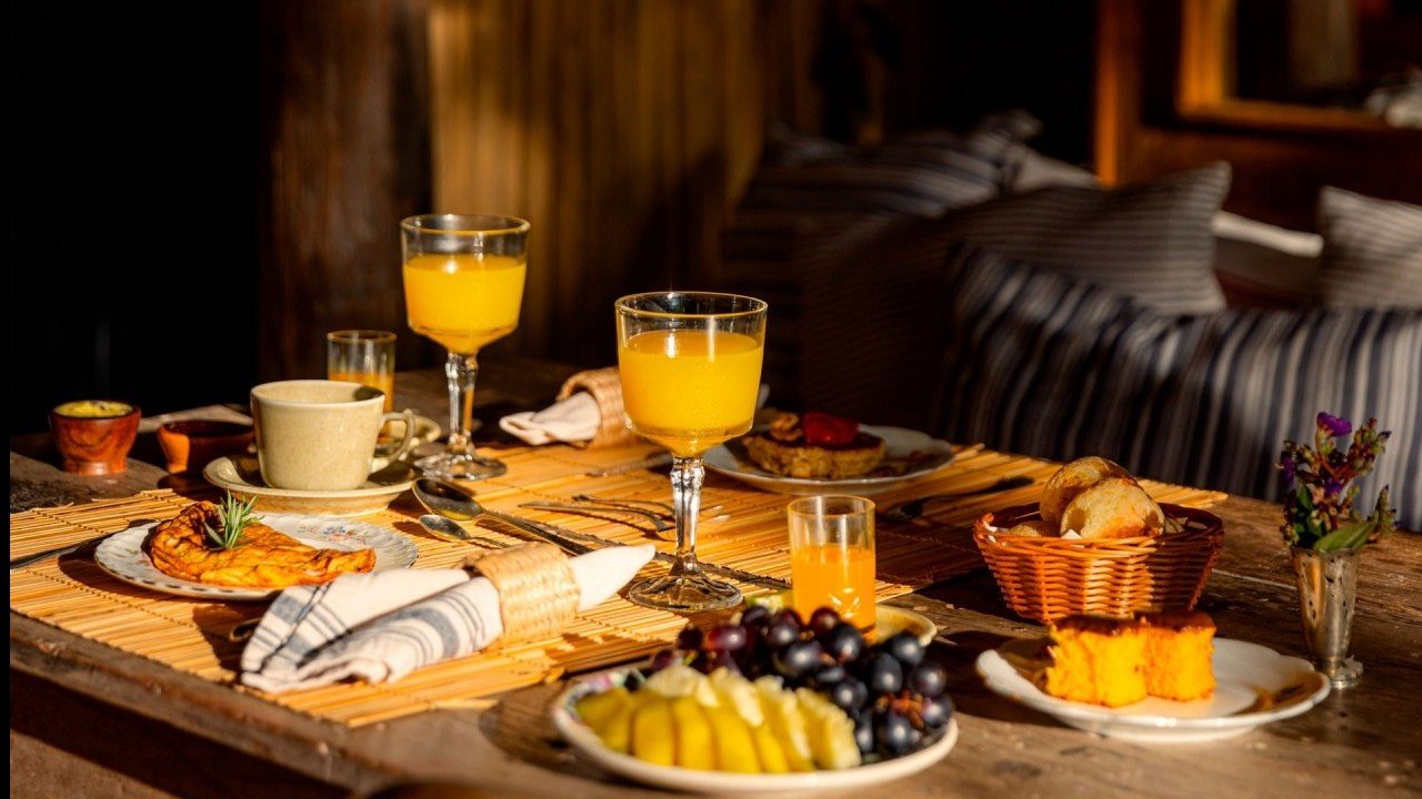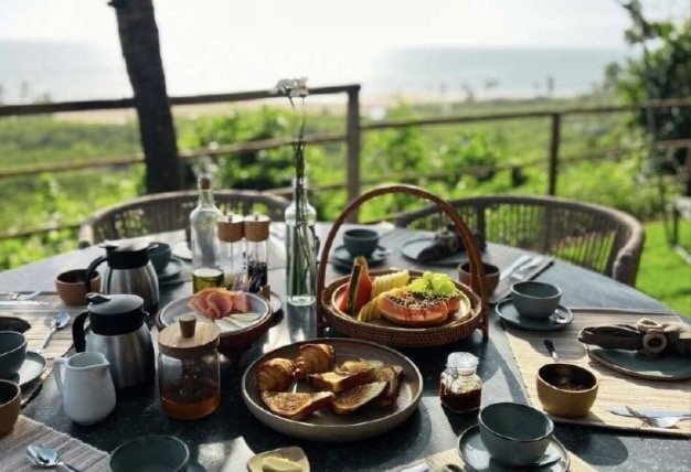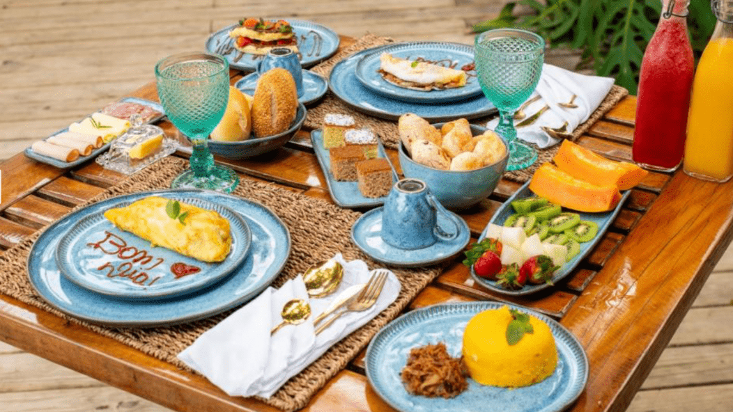 A experiência gastronômica é dividida em dois momentos bem claros: na praia, o serviço é mais leve e descontraído, com entradinhas, petiscos e drinks servidos diretamente nos bangalôs; no restaurante, localizado no topo da falésia, acontece o almoço com uma cozinha com forte influência brasileira e contemporânea, pratos elaborados e com vista panorâmica, com duas opções de horários para reserva.